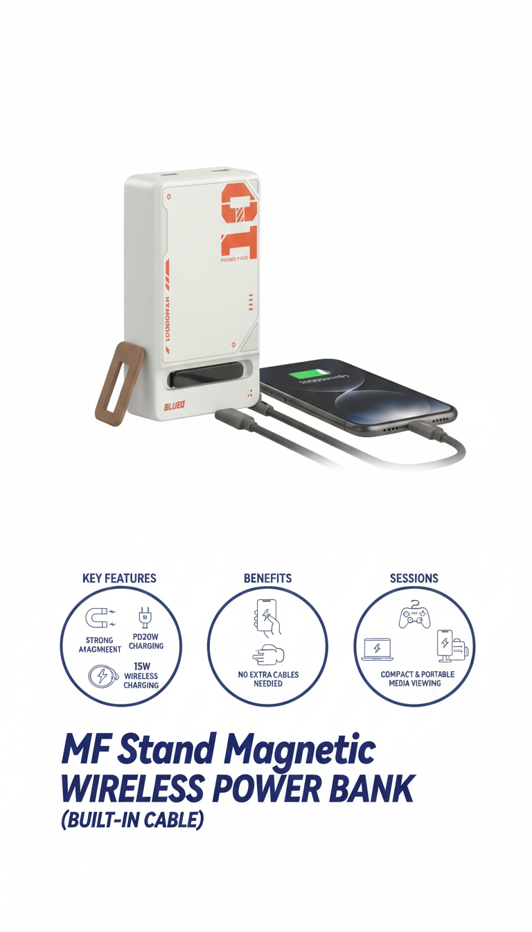 Introducing the BLUEO MF Stand Magnetic Wireless Power Bank (White Edition)—a sleek, ultra-modern charging solution designed for users who demand power, convenience, and premium quality. With its strong magnetic lock, 15W wireless charging, and built-in USB-C cable, this power bank redefines portable charging for the new generation of smartphones and gadgets.