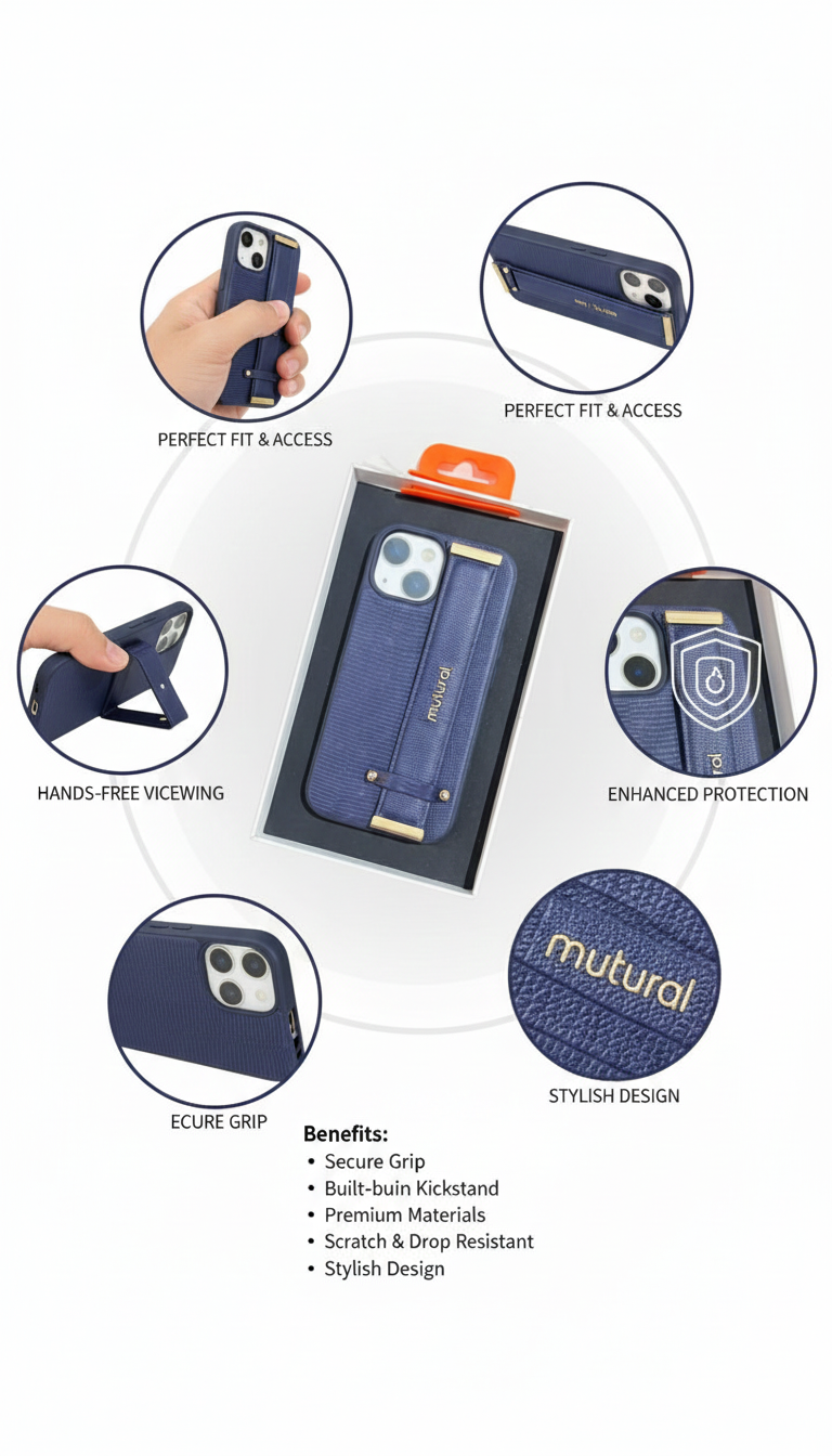 Introducing the Mutural Premium Phone Case, a refined everyday accessory designed for users who value dependable protection, intelligent functionality, and timeless style in one cohesive product. Crafted with precision, this case blends a durable shock absorbing frame with a premium textured exterior that feels secure in the hand while maintaining an elegant, understated appearance suitable for professional and casual environments alike. The integrated secure grip strap enhances one handed usability, reducing accidental drops during daily movement, commuting, or extended phone use, while the reinforced corners provide additional impact resistance without adding unnecessary bulk. A thoughtfully engineered kickstand function allows the strap to transform smoothly into a stable viewing stand, supporting hands free use for video calls, streaming, reading, or desk work at comfortable angles. Designed with modern lifestyles in mind, the case remains fully wireless charging compatible, eliminating the need to remove it during power ups and preserving convenience at home, in the office, or while traveling. The camera surround is carefully raised to help protect lenses from scratches and surface contact, ensuring image quality remains uncompromised over time. Premium materials are selected not only for visual appeal but also for long term durability, resisting wear, fading, and deformation even with frequent use. Subtle metallic accents add a refined finish that elevates the overall aesthetic without appearing flashy, making the case an ideal companion for those who prefer classic luxury over trend driven designs. The slim profile preserves the natural shape of the phone, fitting comfortably in pockets and bags while maintaining a confident grip when held. Precision cutouts allow easy access to ports, speakers, and buttons, delivering responsive tactile feedback and uninterrupted performance. Whether used in professional meetings, social settings, or daily errands, this phone case adapts seamlessly to changing needs, offering both protection and practicality. Its balanced construction supports everyday reliability, ensuring the device remains safeguarded against minor drops, scuffs, and routine handling. The Mutural Premium Phone Case is designed for individuals who appreciate fine details, functional innovation, and a polished look that complements their personal style. By combining secure handling, hands free convenience, and wireless charging support within a single cohesive design, this case delivers an elevated ownership experience that aligns with modern expectations of quality, comfort, and understated sophistication. Every element is engineered to enhance daily interaction with the device, from the softly contoured edges that sit comfortably against the palm to the textured surface that minimizes fingerprints and slipping. The interior lining is designed to cushion the phone gently, reducing friction and helping to preserve the original finish over extended periods of use. Attention to balance ensures the case feels solid yet lightweight, preventing hand fatigue during prolonged use. The adjustable strap mechanism is securely anchored, allowing repeated movement between grip and stand positions without loosening, maintaining confidence and stability throughout its lifespan. This design makes multitasking easier, supporting productivity, entertainment, and communication without compromise. The case transitions effortlessly between environments, complementing business attire, casual wear, and travel gear with equal ease. It is suitable for professionals, students, and anyone seeking a reliable protective solution that does not sacrifice appearance for performance. By offering a refined tactile experience alongside dependable structural protection, the case becomes more than an accessory, serving as an extension of the device itself. Its carefully considered proportions help dissipate minor impacts while maintaining a sleek silhouette that enhances rather than conceals the phone’s design. Built for everyday resilience, the Mutural Premium Phone Case supports a lifestyle that values preparedness, efficiency, and visual harmony. This thoughtful blend of form and function ensures the phone remains protected, accessible, and visually appealing throughout daily routines, making it a practical investment for users who demand quality and longevity from their accessories. It delivers confidence through craftsmanship, offering a dependable solution that aligns with modern expectations while maintaining a classic sensibility, ensuring the device is protected, supported, and presented with enduring elegance every day always reliably.