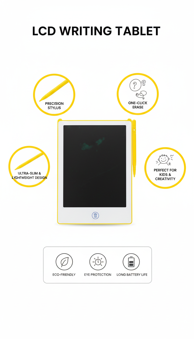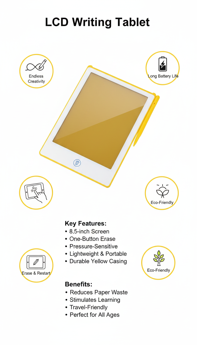 The LCD Writing Tablet is a smart, eco-friendly, and portable digital writing board designed to make drawing, writing, note-taking, and learning easier and more enjoyable for kids and adults alike. Featuring an 8.5-inch pressure-sensitive screen, this lightweight tablet responds smoothly to every touch, allowing users to create bold or thin lines based on the amount of pressure applied. Its vivid display makes doodling, sketching, handwriting practice, and quick reminders more engaging, while the one-button erase function ensures instant clearing of the screen whenever needed. This paperless writing pad helps reduce waste, making it an excellent choice for eco-conscious families who want a reusable alternative to notebooks, sticky notes, and scratch pads. Designed for convenience, the tablet includes a built-in stylus that fits securely into the side slot, keeping it safe from loss and always within reach. The durable outer casing protects the screen from wear and tear, making it ideal for everyday use at home, school, or on the go. Its compact size easily fits into backpacks, handbags, school bags, or travel kits, providing learning and entertainment anywhere—during car rides, classroom sessions, office meetings, or outdoor activities. This versatile writing tablet supports creativity and early learning for children by encouraging them to practice writing, drawing shapes, solving math problems, or expressing imaginative ideas without limits. Adults can also use it for grocery lists, quick office notes, planning tasks, family reminders, or leaving messages at home. The long-lasting battery ensures extended use without frequent replacements, giving users dependable performance anytime they need it. With its user-friendly design, effortless usability, and appealing color, this LCD Writing Tablet offers a practical and enjoyable writing experience for all ages. Whether used as an educational tool, creativity booster, travel companion, or productivity aid, it provides endless possibilities while keeping the environment clean and reducing paper consumption. The tablet is also a thoughtful gift choice for birthdays, return gifts, school events, and festive celebrations, offering a fun and functional option that children truly enjoy using. Designed with safety in mind, the screen is gentle on the eyes and suitable for continuous use without strain. Perfect for homes, classrooms, offices, and travel, the LCD Writing Tablet delivers a seamless blend of innovation, convenience, and creativity, making it one of the most versatile and loved digital tools for daily use.
